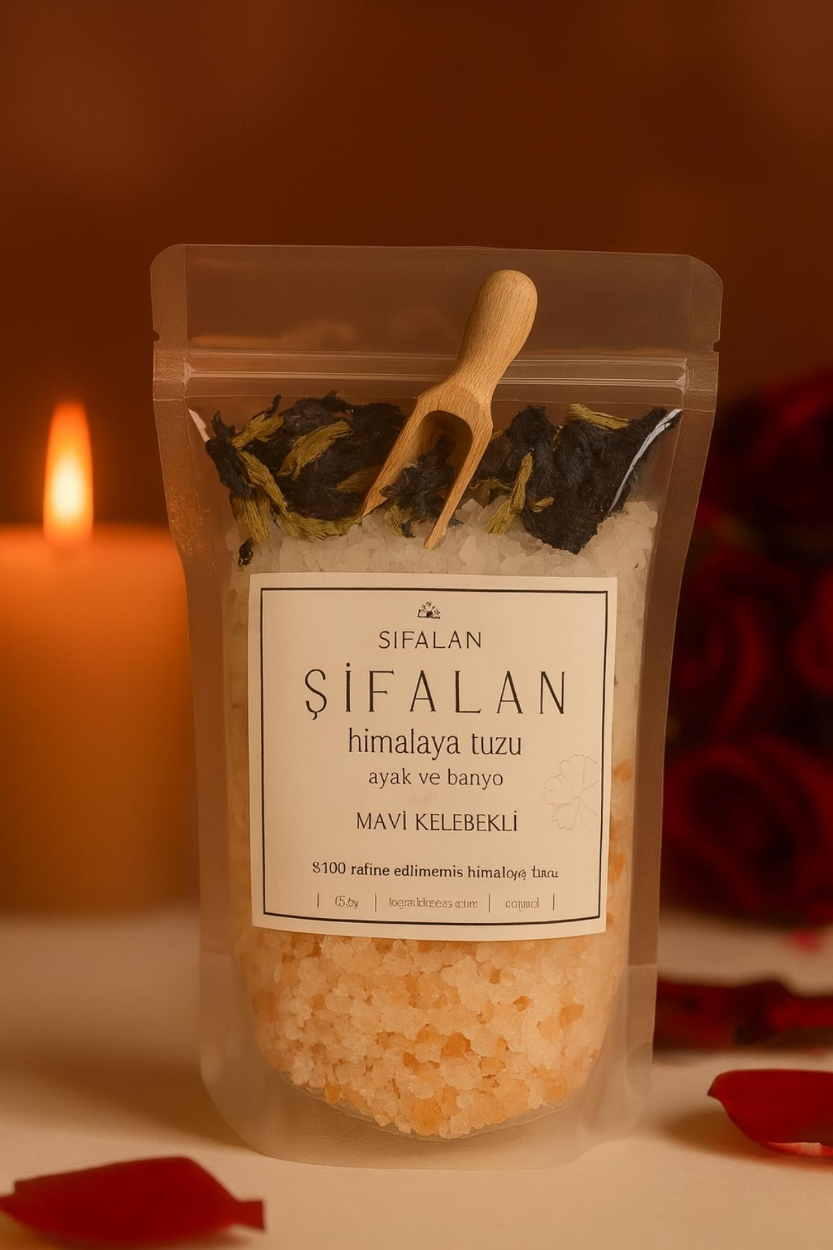 🌿 Özellikler: %100 rafine Himalaya tuzu, mavi kelebek sembolü, ayak ve banyo bakımı, doğal içerik, meditasyon desteği.