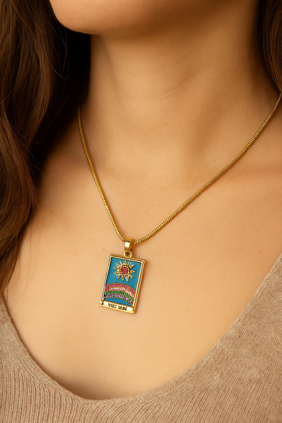 Dikdörtgen Mavi Zeminli Renkli Taşlı Güneş Çelik Kolye