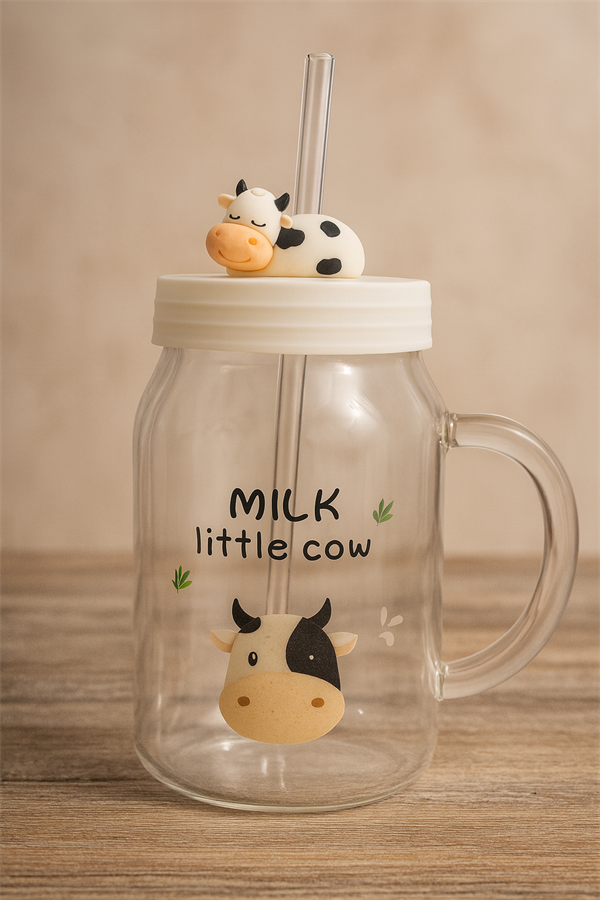 İNEK DESENLİ PİPETLİ BÜYÜK CAM KUPA